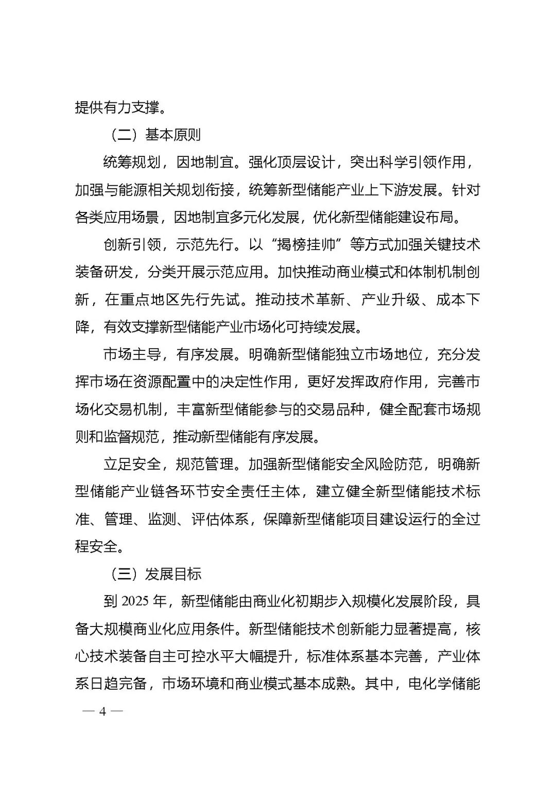 (一)总体要求。一是指导思想中明确坚持以技术创新为内生动力、以市场机制为根本依托、以政策环境为有力保障,稳中求进推动新型储能高质量、规模化发展的总体思路。二是基本原则中充分体现了以规划为引领、以创新为驱动、以市场为主导、以机制为保障、以安全为底线的发展思路,明确统筹规划、因地制宜,创新引领、示范先行,市场主导、有序发展,立足安全、规范管理四项发展原则。三是在发展目标中,更注重通过支持技术和商业模式创新、健全标准体系、完善政策机制等措施,充分激发市场活力,推动构建以需求为导向,以充分发挥新型储能价值为目标的高质量规模化发展格局。