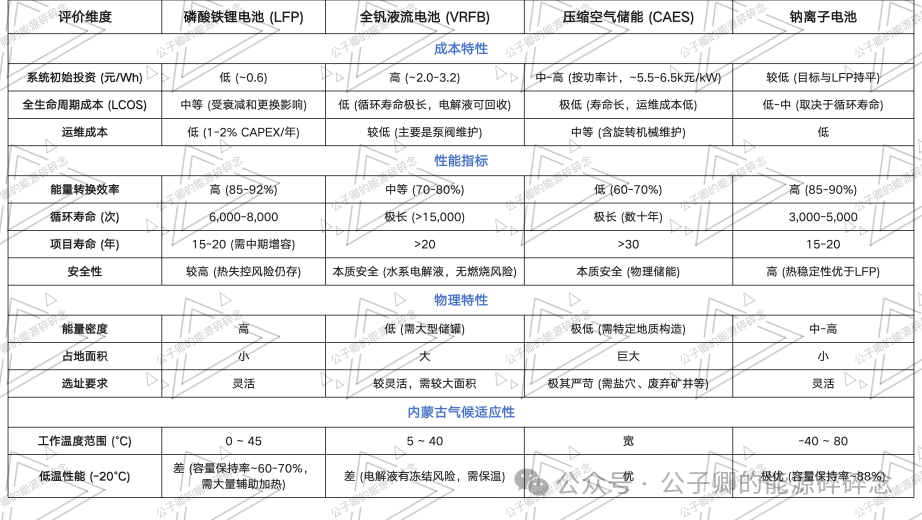 3、增值业务:电力辅助服务市场 除了容量补偿和能量套利这两大主要收入来源外,内蒙古的独立储能电站还可以作为独立市场主体,参与电力辅助服务市场,获取第三重收益。这主要包括调峰、调频和备用等服务。 调频(Frequency Regulation):蒙西电网的调频市场对AGC(自动发电控制)单元进行补偿,补偿模式主要为“里程补偿”。根据最新的规则,调频里程的申报价格范围调整为2-12元/MW 。虽然这一价格相比早期的6-15元/MW有所下调 ,反映出市场竞争的加剧,但对于技术性能优越的储能电站而言,仍然是一项重要的增值收入。 备用(Reserve):指预留一部分电力容量,以应对突发的发电机组故障或负荷骤增。储能电站可以将其部分容量作为备用资源参与市场报价,根据中标容量和时间获得补偿。 参与辅助服务市场实现了“收益叠加”(Revenue Stacking)。一个先进的储能电站,可以通过其能量管理系统(EMS)进行精细化管理,将一部分功率容量(例如100MW中的20MW)用于响应高价值的调频指令,同时将其大部分能量容量(400MWh)用于执行峰谷套利策略。这种多任务并行操作,能够最大化资产的利用率和整体收益水平。虽然辅助服务收入在总收入中的占比可能不高(预计在5-10%),但它能有效提升项目的整体投资回报率。 03 为内蒙古选择最优的4小时储能方案 1、构网型(Grid-Forming)储能的崛起 构网型储能,相较于传统的跟网型(Grid-Following)储能,其核心区别在于控制方式。跟网型储能作为电流源,被动地跟随电网的频率和电压,只能进行功率的吞吐;而构网型储能则作为电压源,能够主动、独立地建立和支撑电网的电压和频率,表现得更像一台传统的同步发电机。 2、 多维度技术对比分析 针对内蒙古100MW/400MWh网侧独立储能的应用场景,我们选取四种代表性的新型储能技术进行综合对比,盗图的朋友,拿走不谢! 综上所述:对于2025年在内蒙古投资的100MW/400MWh项目,磷酸铁锂电池凭借其成本优势和市场成熟度,仍是短期内最具可行性的基准选择。 04 100MW/400MWh项目案例研究 1、核心假设:根据自己家的情况自行调整 年有效运行天数:330天 (考虑检修和故障) 每日循环次数:1次 (一充一放) 容量补偿:200次 系统综合效率 (Round-Trip Efficiency):85% 平均充电电价 (蒙西现货市场):0.25 元/kWh 平均放电电价 (蒙西现货市场):0.65 元/kWh (形成0.40元/kWh的净价差) 融资结构:30%资本金,70%银行贷款,贷款利率5%,期限10年。 2、 敏感性分析 2025年的“上网电价”是一个由三部分构成的复合体,LCOE已不再是其收入的直接对标。 项目收益对能量套利价差最为敏感。若未来市场竞争加剧导致价差收窄,IRR将受到显著影响。 其次是容量补偿政策的稳定性和持续性。任何对0.35元/kWh标准或10年期限的负面调整,都将直接冲击项目的财务基础。 初始投资CAPEX的变动也对回报率有直接影响,但其敏感性低于前两者。 年运行循环次数直接影响收入规模,电站的可用率和调度策略至关重要。 综合来看,在当前政策框架下,内蒙古的100MW/400MWh网侧独立储能项目具有极强的财务可行性和投资吸引力。其核心在于政策性收入(容量补偿)与市场化收入(能量套利)的有效结合,构建了一个风险可控、回报可观的商业模式。 05 战略建议与风险评估 1、个人观点仅供参考,强烈建议投资 结构性需求强劲:内蒙古“新能源倍增行动”创造了确定且巨大的储能需求,项目并非基于短期市场炒作,而是服务于自治区能源战略的长期刚需。 商业模式清晰且优越:以“0.35元/kWh容量补偿+能量套利+辅助服务”为核心的收益模型,在全国范围内具有领先优势。长达10年的容量补偿为项目提供了坚实的收入保障,显著降低了投资风险,确保了项目的融资可行性。 财务回报可观:项目预计可实现超过15%的全投资内部收益率,并在10年补偿期内收回投资,具备极强的盈利能力。 政策支持力度空前:从自治区政府到能源局,均将独立储能视为构建新型电力系统的关键环节,给予了包括容量补偿、充电电价豁免、市场准入等在内的一揽子支持政策,为项目的顺利实施和运营创造了良好的外部环境。 此项投资建议的核心前提是项目能够成功入选自治区2025年度独立新型储能建设项目清单,并严格执行政府要求的标准,锁定0.35元/kWh的补偿标准。 2、面临的主要风险及相应的规避策略 对于投资者和开发者内蒙古正处于其能源革命的关键时刻,而独立储能电站则是这场革命的赋能者和稳定器。 2025年,在强力政策的驱动下,将是投资内蒙古储能市场的黄金窗口期。早期进入者将凭借优厚的容量补偿政策和广阔的套利空间,获得丰厚的投资回报。 展望未来,内蒙古的储能市场将逐步从政策驱动向市场驱动过渡。 随着市场机制的不断成熟,容量补偿可能会被容量市场或容量电价所取代,能量套利的价差也将回归至一个由市场供需决定的合理水平。届时,市场的竞争将更多地围绕运营效率、技术性能和商业模式创新展开。